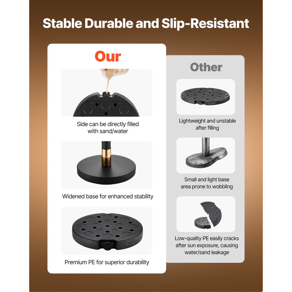 Plnitelná a podlahově šetrná základna: Naplňte každou základnu vodou nebo pískem (až 2,6 kg, 3,5 kg) a spolehněte se na gumový kroužek, který odolá převrácení a zároveň chrání podlahu.