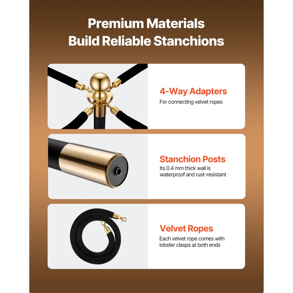 Sloupky z sametových lan: Naše sloupky jsou vyrobeny z robustních sloupků z nerezové oceli 201 a mají tlustá sametová lana a elegantní kovovou povrchovou úpravu, která zajišťuje spolehlivé vedení davu a zároveň okamžitě pozvedá váš vstup luxusním ceremoniálním vzhledem.