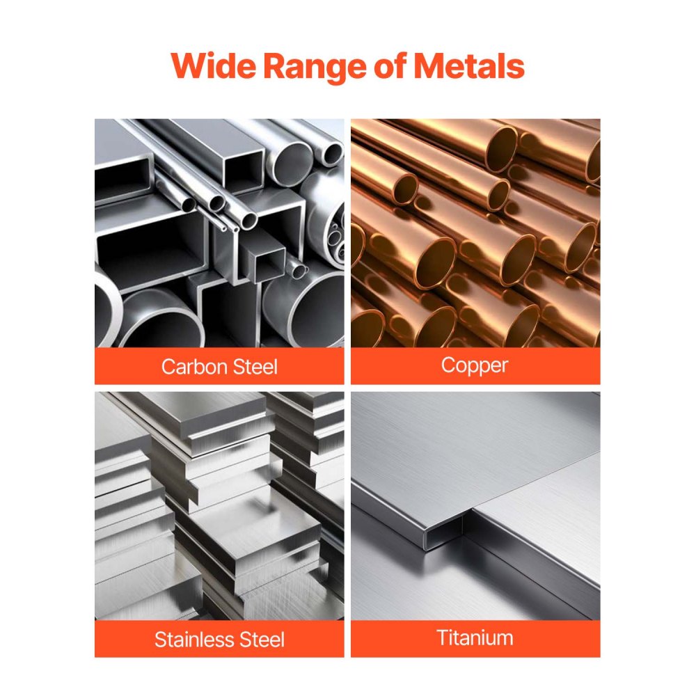 Použitelné materiály: Tato svářečka je ideální pro svařování uhlíkové oceli, mědi, nerezové oceli a titanu. Podporuje elektrody 6010, 6011, 6013 a 7018 a dokáže svařovat hliník o průměru 1/4" a nízkouhlíkovou ocel o průměru 3/8".