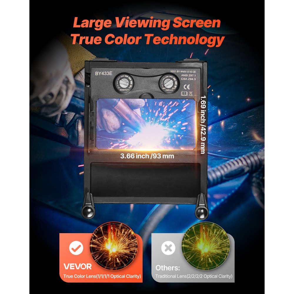 Zobrazení v věrných barvách: Svářečská kukla VEVOR s velkou obrazovkou o rozměrech 93 x 43 mm (3,66" x 1,69"), vylepšenou technologií zobrazení v věrných barvách a optickou čistotou 1/1/1/1 poskytuje jasný, ostrý a přirozený obraz pro bezpečné a přesné svařování.