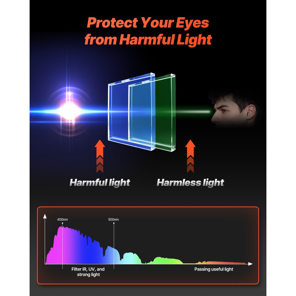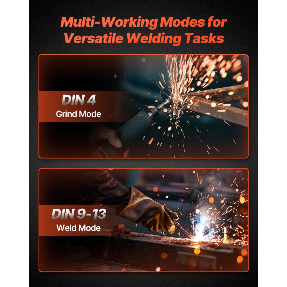 Milisekundové automatické ztmavování: Naše svářečská kukla, vybavená 2 inteligentními senzory oblouku, se automaticky ztmaví za pouhých 1/20 000 sekundy – filtruje škodlivé a intenzivní světlo, snižuje oslnění obloukem, zvyšuje vizuální ostrost a chrání oči.