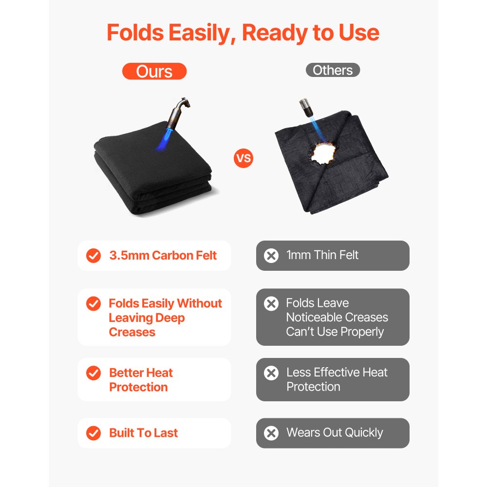 Odolnost vůči vysokým teplotám: Dvojbalení svařovacích deček z uhlíkové plsti VEVOR o rozměrech 20" x 36" odolává vysokým teplotám až do 1800 °F (982 ℃) a poskytuje vynikající odolnost vůči teplu a plamenům, čímž chrání před jiskrami, plameny, roztaveným kovem a intenzivním žárem.