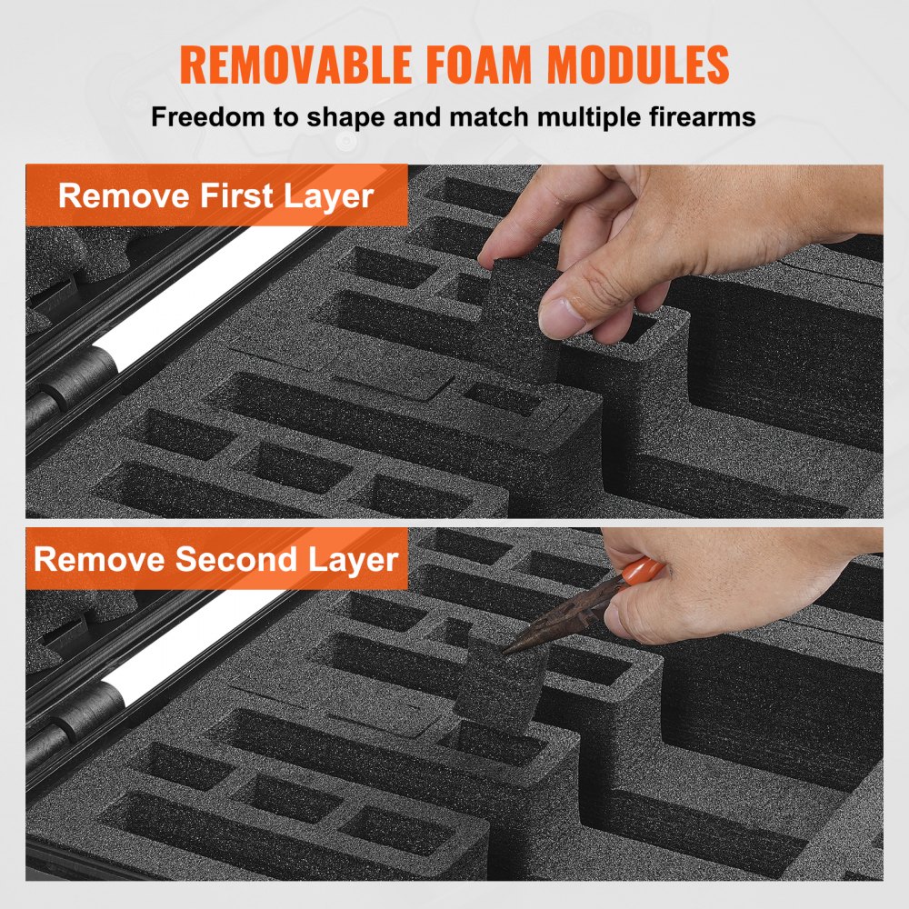 Vícenásobné zabezpečení: Pouzdro je vyrobeno z odolného PP materiálu a poskytuje vynikající ochranu před náhodnými pády a nárazy během přepravy. Uvnitř je vybaveno několika vrstvami ochranné houbičky, včetně vejčité pěny na víku, XPE pěnových vložek pro umístění zbraně a další ochranné pěny ve spodní části, což zajišťuje bezpečné uchycení a zabraňuje poškození a poškrábání způsobenému uvolněnými díly a zároveň umožňuje snadný přístup.