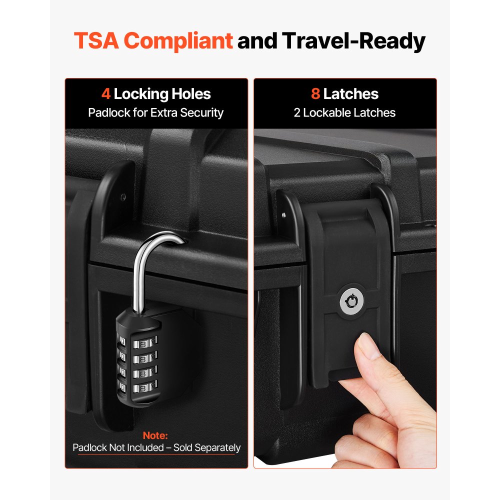 V souladu s TSA: Toto pouzdro na pušku splňuje normy TSA a je vhodné pro cestování letadlem, vlakem a jinými dopravními prostředky. Je vybaveno několika západkami, do vestavěných otvorů pro uzamčení můžete pro větší bezpečnost přidat visací zámky (Poznámka: visací zámky nejsou součástí balení).