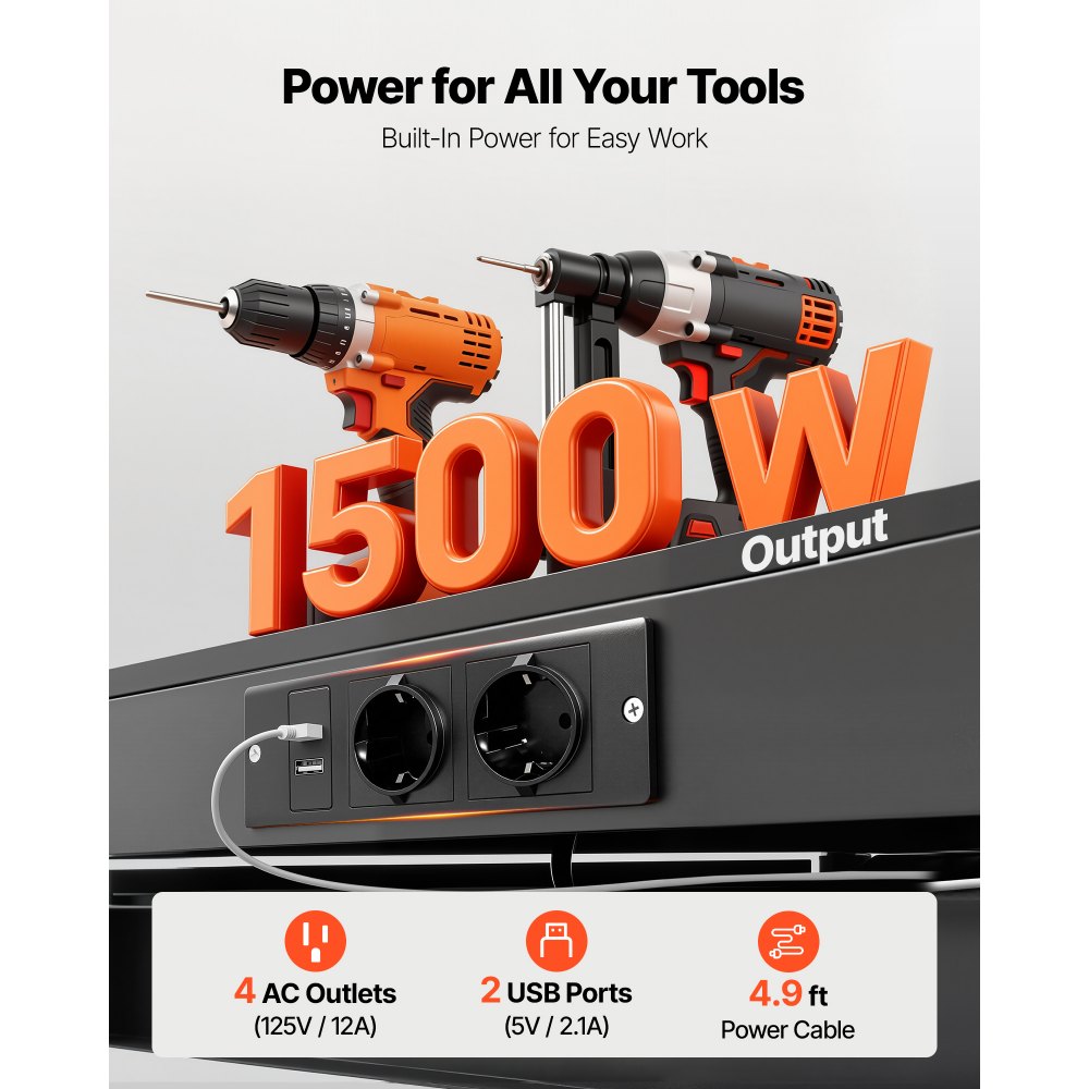 Všestranná zásuvka: Zůstaňte napájeni díky čtyřem síťovým zásuvkám a dvěma USB portům, které vám umožní provozovat více nástrojů najednou. Kabel o délce 1,6 m našeho dřevěného pracovního stolu vám poskytuje flexibilitu a zajišťuje, že máte napájení vždy po ruce.