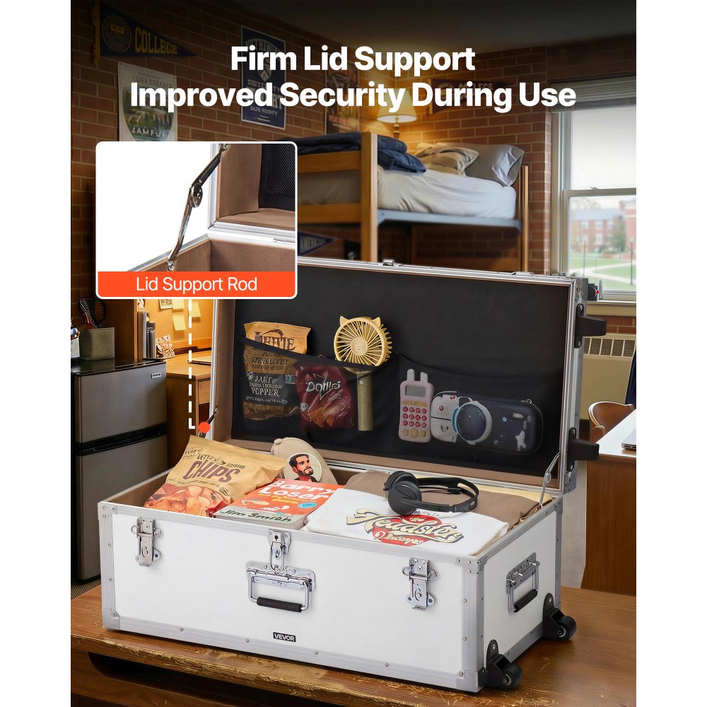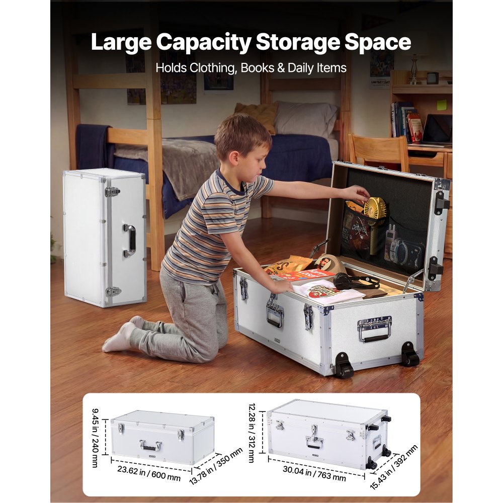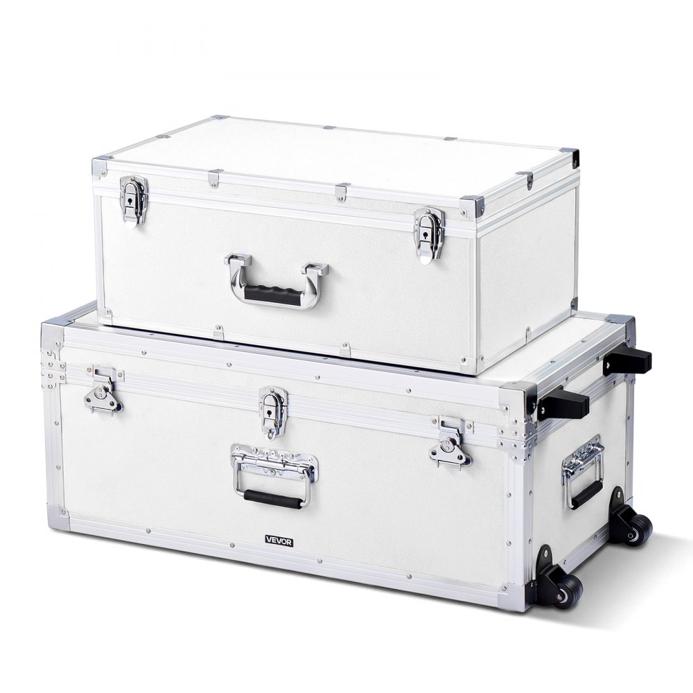Kovový úložný truhlík, sada 2 kusů, dřevěné úložné boxy na kufry s visacími zámky, velký truhlík obsahuje kolečka a 3 kovové rukojeti, dekorativní úložný truhlík s víky na cesty, do bytu, na kolej, bílý | Skladovací a manipulační zařízení | Originalnitextil.cz