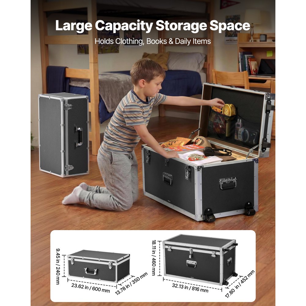 Kovový úložný truhlík, sada 2 kusů, dřevěné úložné boxy na kufry s visacími zámky, velký truhlík obsahuje kolečka a 3 kovové rukojeti, dekorativní úložný truhlík s víky na cesty, do bytu, na kolej, černý