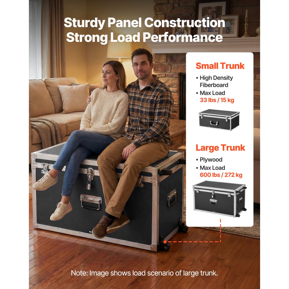 Odolná panelová konstrukce: Tento velký kufr je vyroben z překližkových panelů; maximální nosnost 272 kg; malý kufr je vyroben z dřevovláknitých panelů; maximální nosnost 15 kg