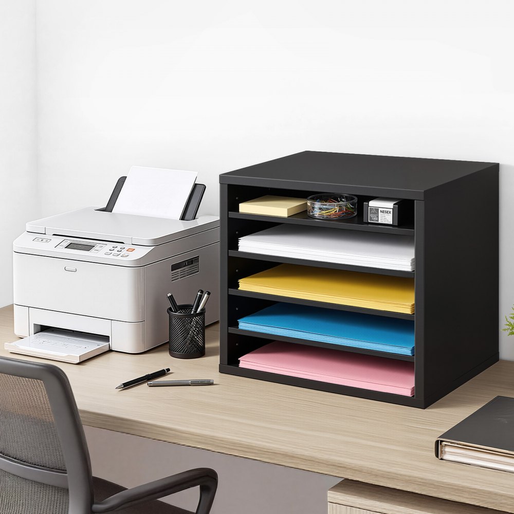 Organizér na literaturu VEVOR, 5přihrádková kancelářská poštovní schránka s nastavitelnými policemi, dřevěný třídič poštovních schránek s MDF, pracovní deska kancelářský organizér pro domácí učebnu, úložný prostor na spisy, dokumenty, papíry, černý