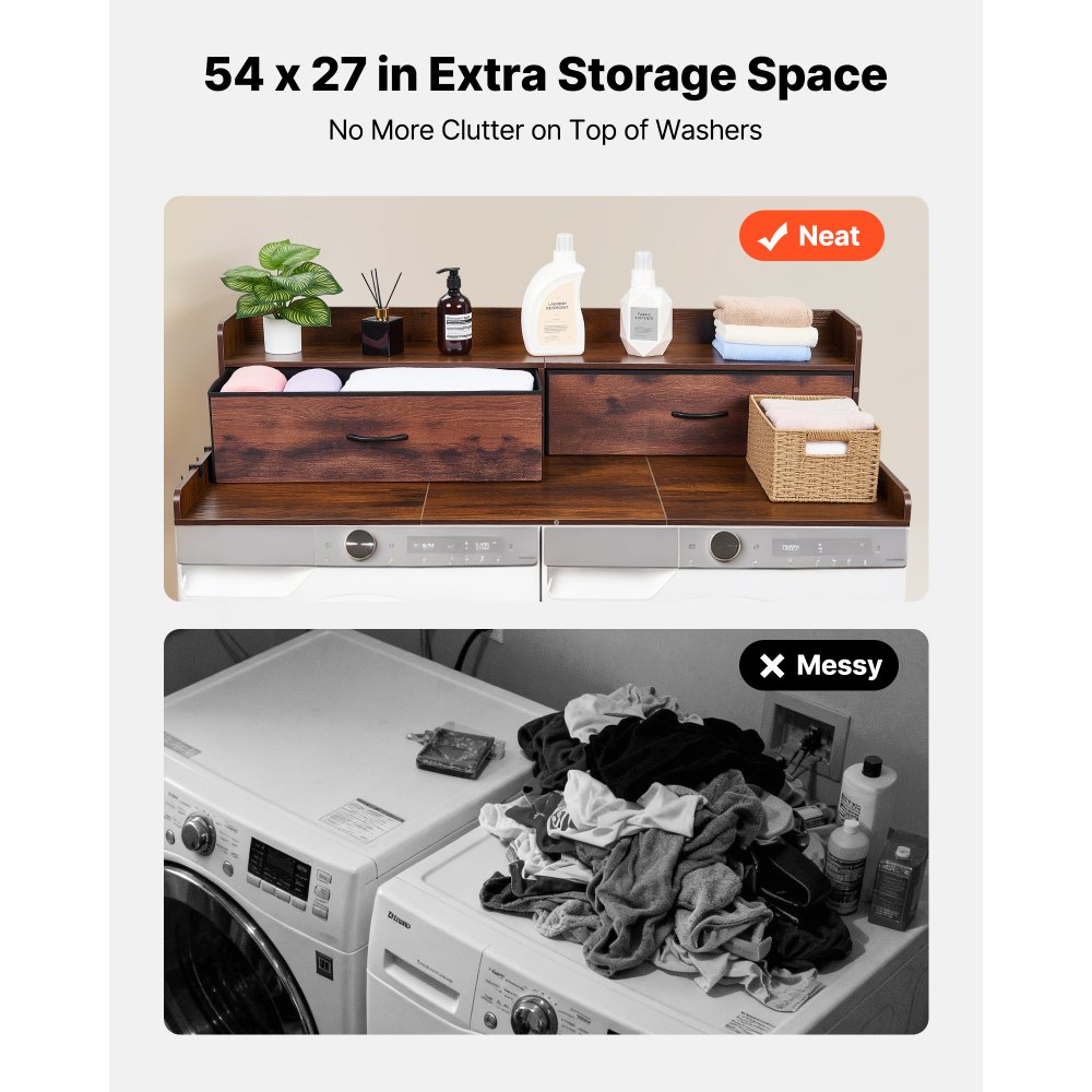 Pracovní deska na pračku a sušičku s policí, 137 x 69,9 cm Dřevěná vrchní deska na pračku a sušičku se 2 zásuvkami a háčky, Vrchní deska na pračku do skříně, spíže, organizace a úložný prostor, hnědá | Skladovací a manipulační zařízení | Originalnitextil.cz