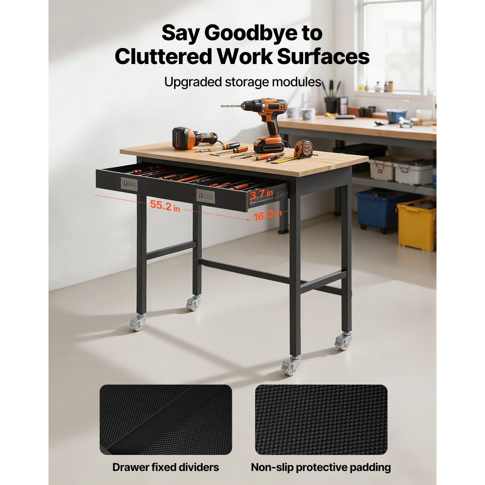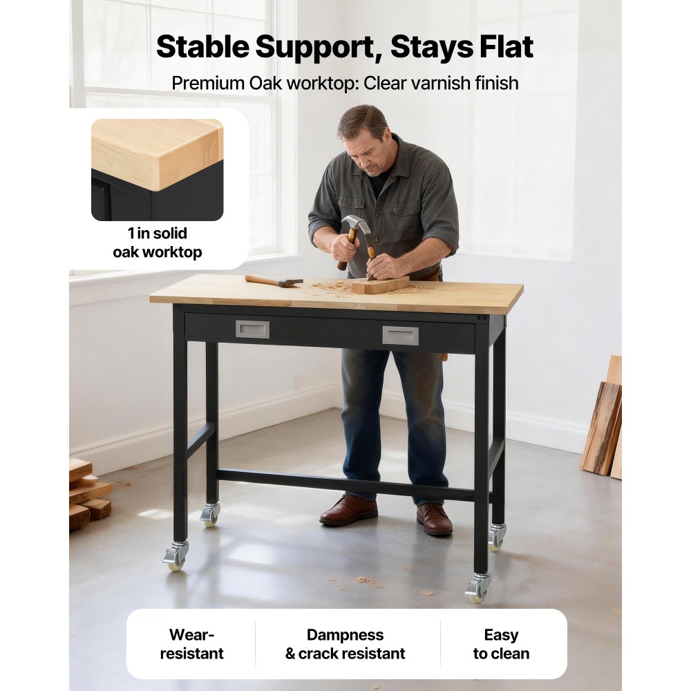Pracovní stůl VEVOR 1220 mm, nosnost 680 kg, garážový pracovní stůl se zásuvkovým úložným prostorem a kolečky, dílenský stůl na kolečkách, odolný dubový pracovní stůl do garáže, dílny, kanceláře a domácnosti | Skladovací a manipulační zařízení | Originalnitextil.cz
