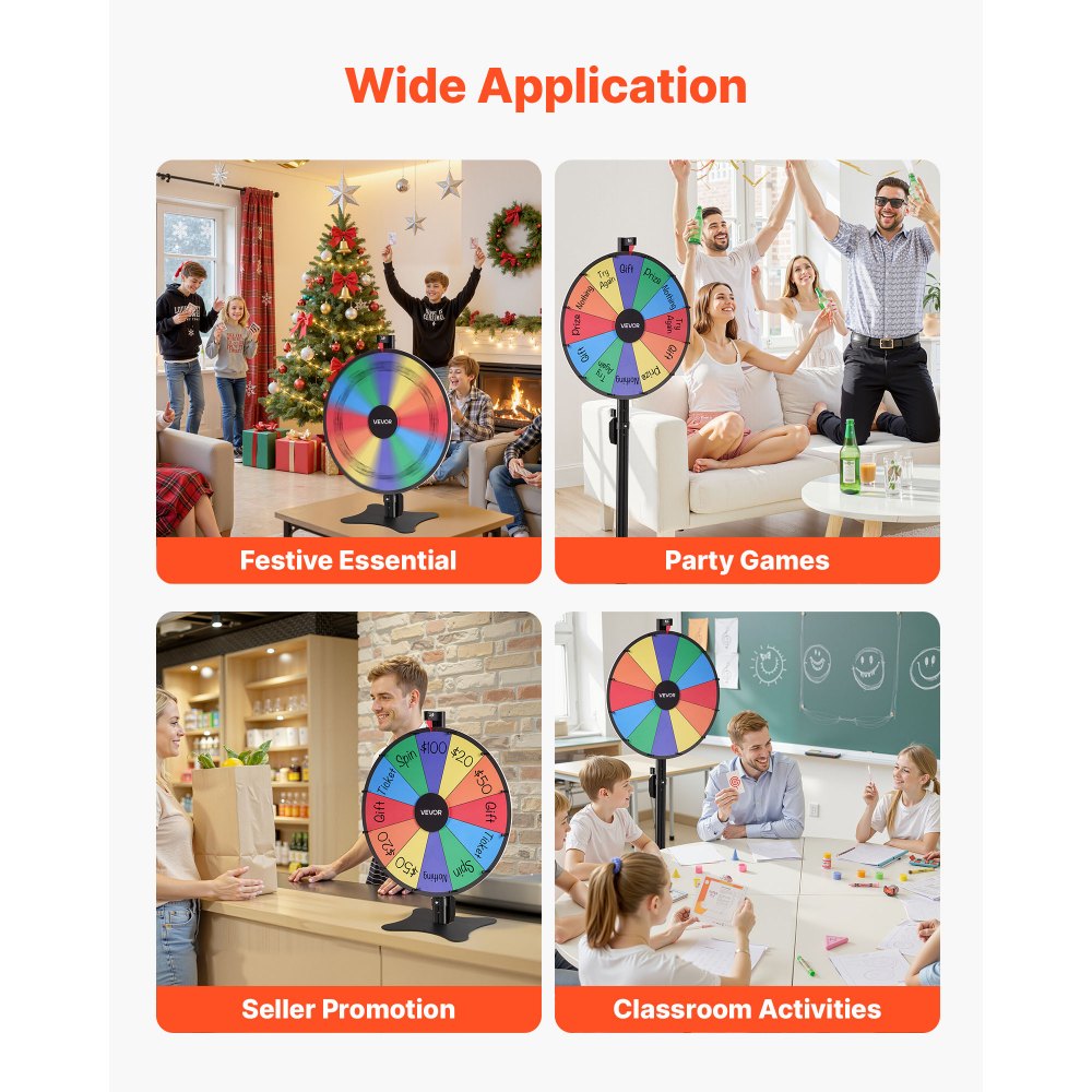 Použití na stole a na podlaze: Toto kolo s výherními koly nabízí dvě možnosti montáže. Pro použití na stole použijte 1 tyč a podstavec o délce 762 mm; pro použití na podlaze o délce 1510 mm přidejte další 1 tyč. Ideální pro večírky, veletrhy, učebny a další účely.