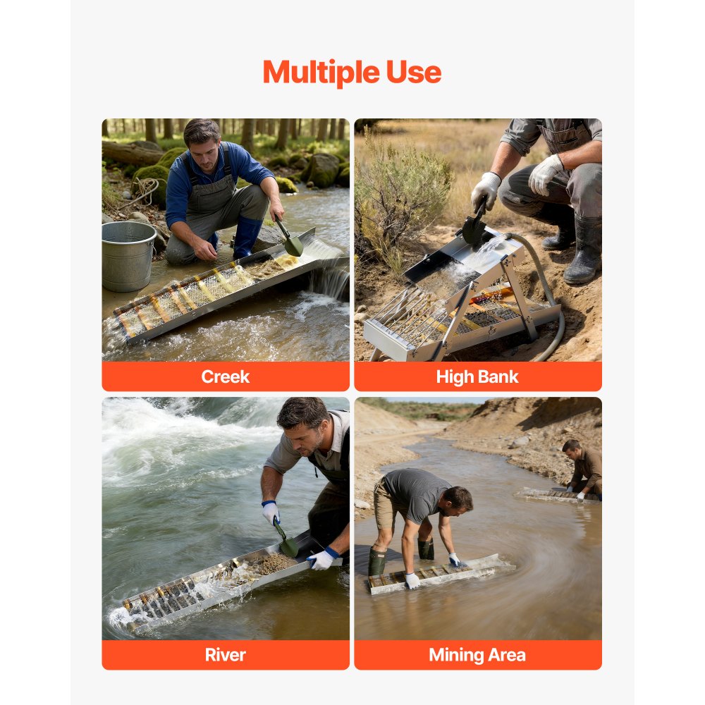 Duální režim High Banker Gold Sluice: Ruční přepínání mezi režimem stavidla a nastavením High Banker. Režim High Banker efektivně zvládá větší dávky, zatímco režim stavidla je vhodný pro mělkou vodu a malé potoky a splňuje tak různé potřeby rýžování.