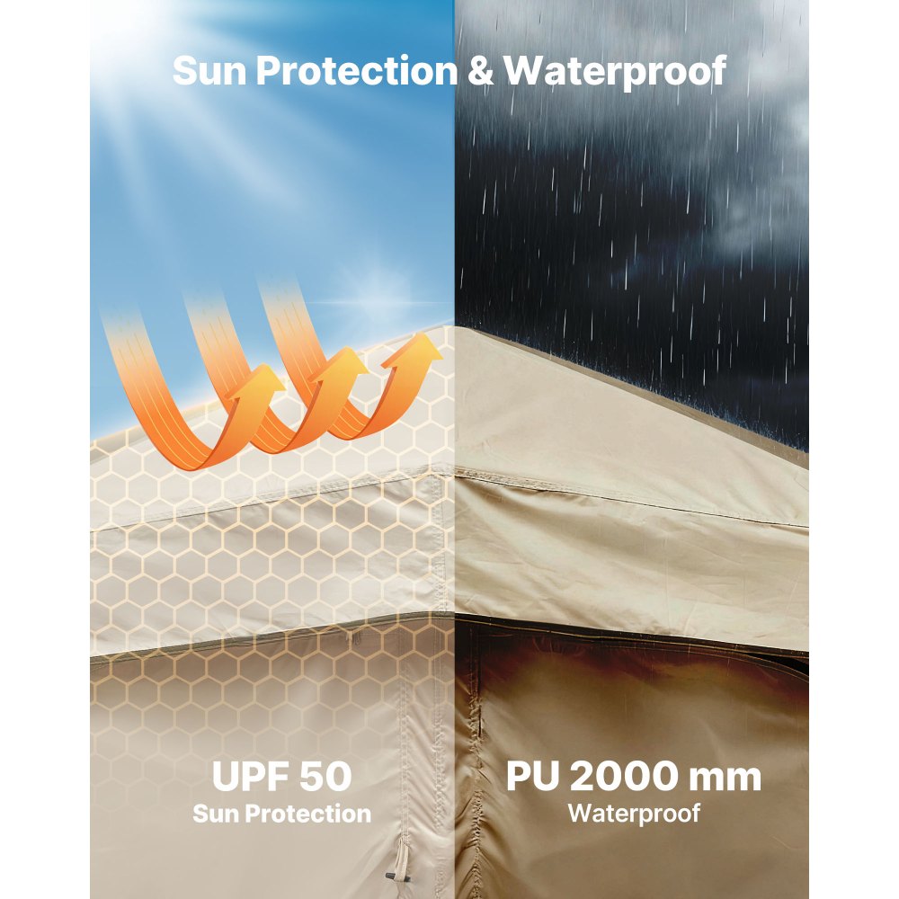 Ochrana před sluncem a voděodolnost: Náš stan je vyroben z oxfordské tkaniny 150D s ochranou UPF 50 a blokuje ostré sluneční světlo. Boční okna zlepšují proudění vzduchu. Voděodolnost PU 2000 mm umožňuje rychlý stékání deště a udržuje interiér suchý.