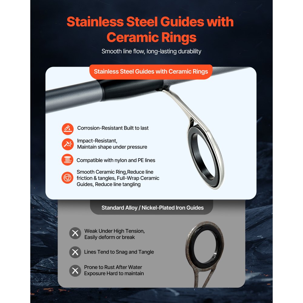 Keramická očka: Naše pruty na lov okounů jsou vyrobeny z nerezové oceli s keramickými vložkami a jsou vyrobeny pro dlouhou životnost a odolnost proti korozi, což zajišťuje spolehlivý výkon v jakémkoli prostředí. Hladké keramické kroužky snižují tření a minimalizují zamotávání vlasce, takže jsou kompatibilní s nylonovými i PE vlasci pro bezproblémový rybolov.