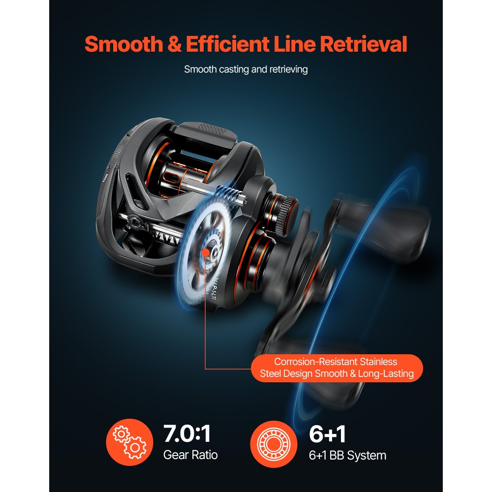 Efektivní výkon: Tento sladkovodní rybářský prut, vybavený vysoce přesnými kuličkovými ložisky 6 + 1 a převodovým poměrem 7,0:1, zajišťuje plynulé a efektivní nahazování a vytahování vlasce. Snadno si poradí s různými druhy ryb, jako jsou okouni velkoústí a maloústí, a vylepší tak váš celkový rybářský zážitek.