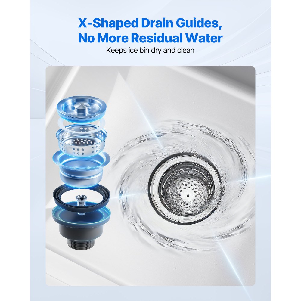 Systém plynulého odvodnění: Tato nádoba na led z nerezové oceli má odvodňovací design ve tvaru X, který efektivně odvádí vodu. Suchý vnitřek se snáze čistí a udržuje i při každodenním komerčním používání.