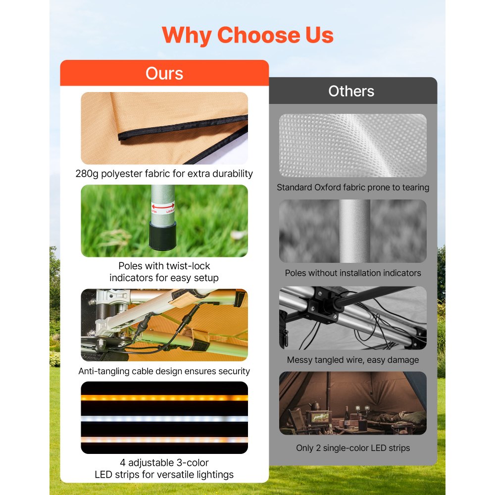 3barevné LED osvětlení: Vestavěné 4 nastavitelné LED pásky s přepínáním jedním dotykem mezi teplým, bílým a studeným světlem. Naše markýza s rozsahem 270 stupňů podporuje napájení z auta 12 V nebo přes USB, což vytváří útulnou atmosféru pro noční aktivity.