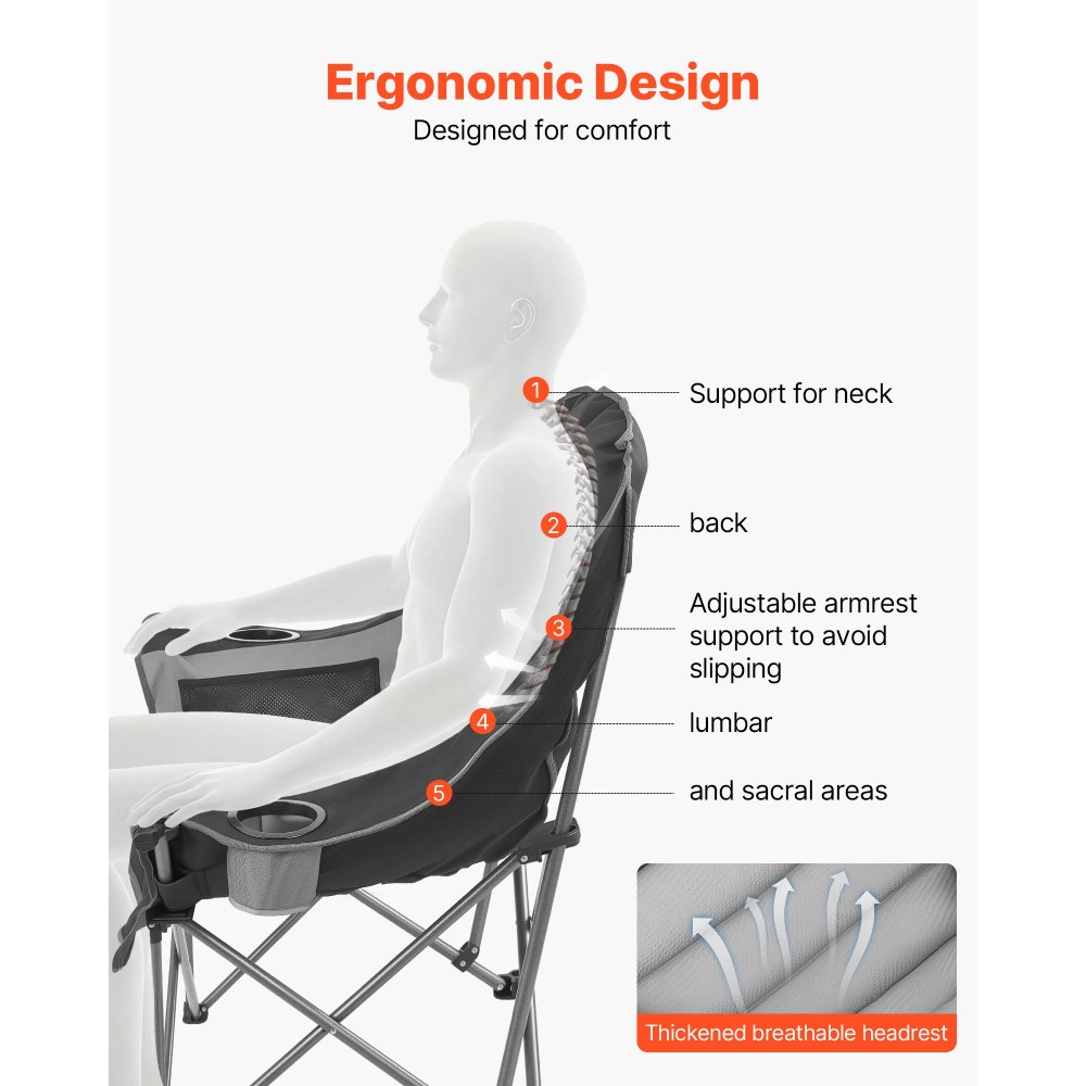 Nadměrné kempingové židle VEVOR, nosnost 204 kg, přenosné polstrované skládací kempingové židle s dvojitými držáky na nápoje a sklenice na víno, přepravní taška pro venkovní použití, rybaření, černé a šedé, 1 balení