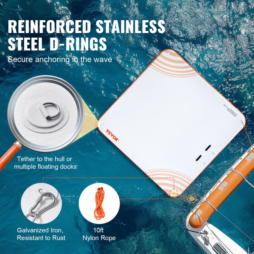 Bezpečné ukotvení, příjemná zábava: S naším spolehlivým systémem zůstaňte ukotveni v klidu. Naše plovoucí rohož na vodu je vybavena 6 D-kroužky z nerezové oceli, 4 pozinkovanými železnými háky a 3metrovým nylonovým lanem a zůstává pevně ukotvena ve vodě. Háky odolné proti korozi zaručují dlouhou životnost a umožňují vám užívat si nekonečná vodní dobrodružství.