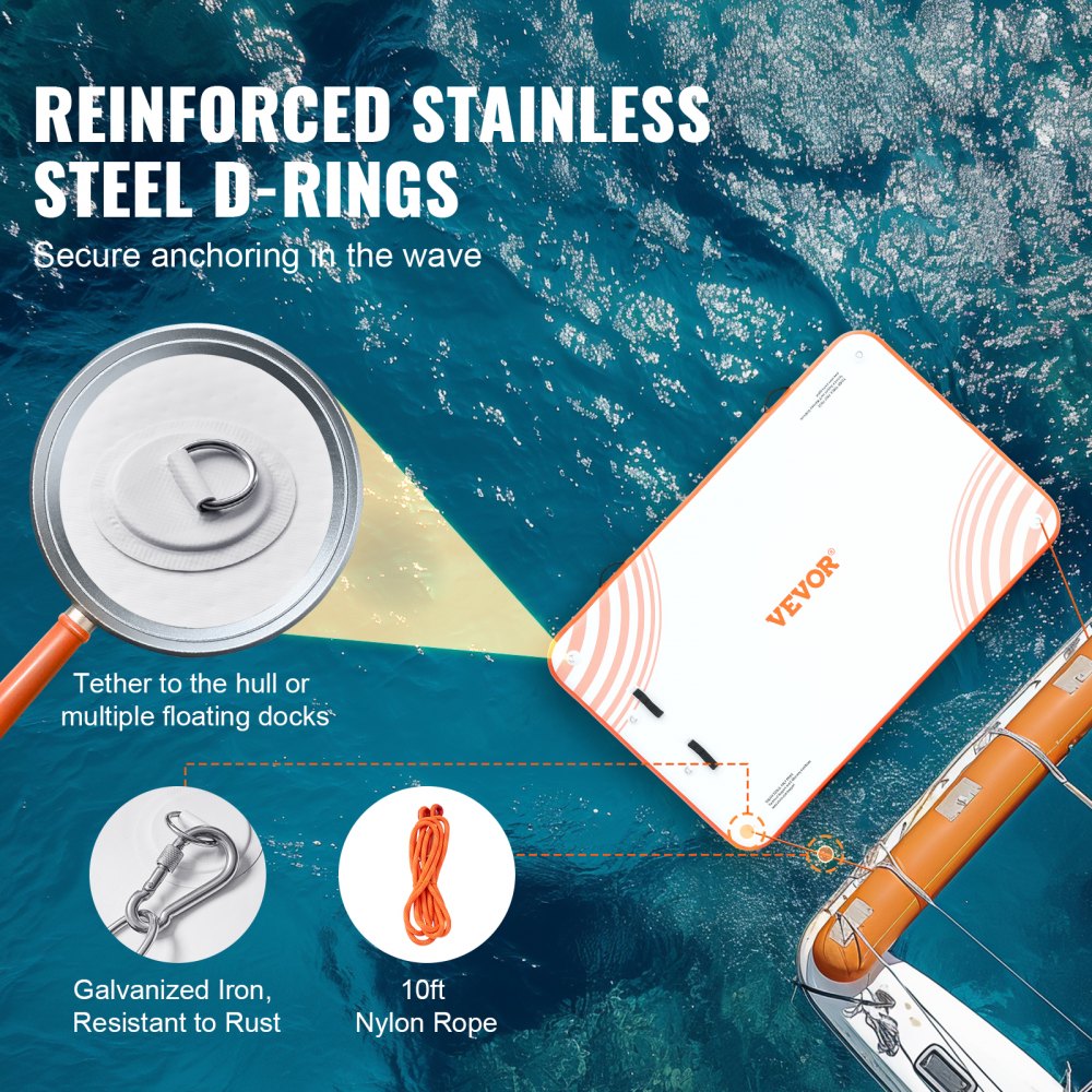 Bezpečné ukotvení, příjemná zábava: S naším spolehlivým systémem zůstaňte ukotveni v klidu. Naše plovoucí rohož na vodu je vybavena 6 D-kroužky z nerezové oceli, 4 pozinkovanými železnými háky a 3metrovým nylonovým lanem a zůstává pevně ukotvena ve vodě. Háky odolné proti korozi zaručují dlouhou životnost a umožňují vám užívat si nekonečná vodní dobrodružství.