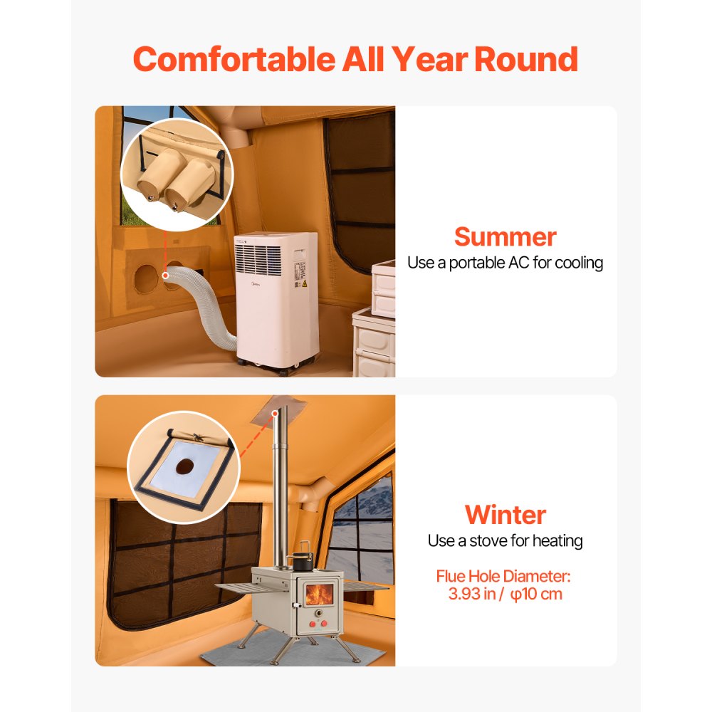 186 čtverečních stop (186 čtverečních stop) prostorného interiéru: S rozměry 15,75 x 11,81 x 7,22 stop (4,8 x 3,6 x 2,2 m) se v tomto nafukovacím kempingovém stanu pohodlně ubytuje 8–12 osob. Součástí jsou odnímatelné závěsy, které umožňují vytvoření dvoupokojového uspořádání nebo prostorného obývacího prostoru. Stan je vybaven přípojkou na sporák a zásuvkou pro střídavý proud, takže je ideální pro celoroční použití.