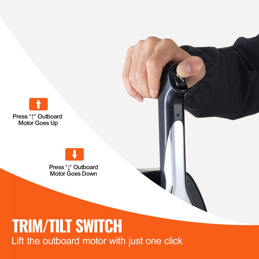 Spínač trimu a náklonu: Vylepšete si zážitek z plavby pomocí spínače trimu a náklonu přímo na rukojeti ovládací páky. Tato konstrukce umožňuje snadné nastavení polohy záďového motoru, což usnadňuje nakládání/vykládání nákladu a zabraňuje dlouhodobému ponoření motoru. Stisknutím tlačítka „↑“ nakloníte motor nahoru a stisknutím tlačítka „↓“ jej nakloníte dolů.