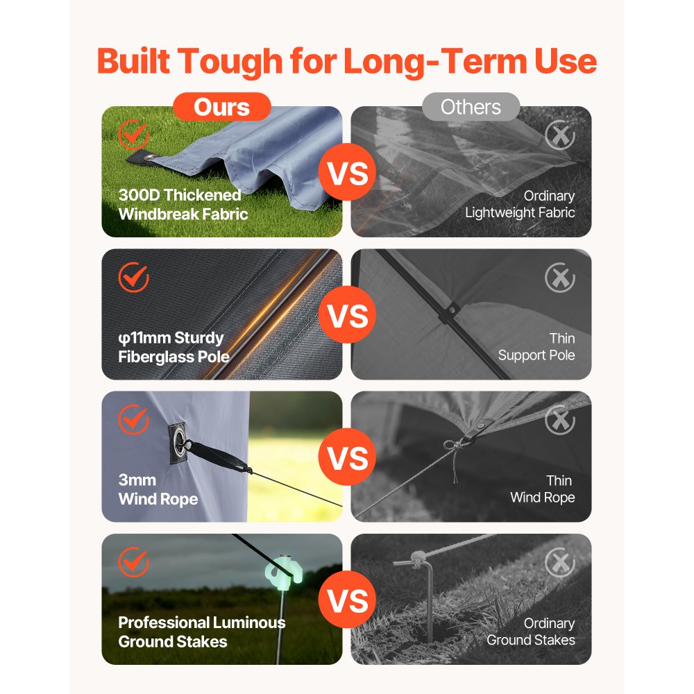 Větruodolná konstrukce: Vysoce pevné tyče ze skelných vláken a šest zesílených rolovacích panelů proti větru zvyšují stabilitu a soukromí. Boční zapínání typu smyčka-smyčka zabraňuje třepotání panelů ve větru. Výklopná stříška obsahuje několik zemních kolíků a kotevních lan pro bezpečné venkovní umístění. (Tip: Za silného deště nebo bouře ji pro bezpečnost rozeberte.)