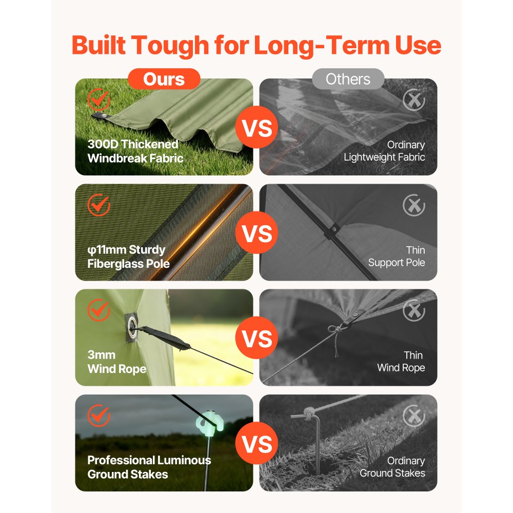 Větruodolná konstrukce: Vysoce pevné tyče ze skelných vláken a šest zesílených rolovacích panelů proti větru zvyšují stabilitu a soukromí. Boční zapínání typu smyčka-smyčka zabraňuje třepotání panelů ve větru. Výklopná stříška obsahuje několik zemních kolíků a kotevních lan pro bezpečné venkovní umístění. (Tip: Za silného deště nebo bouře ji pro bezpečnost rozeberte.)