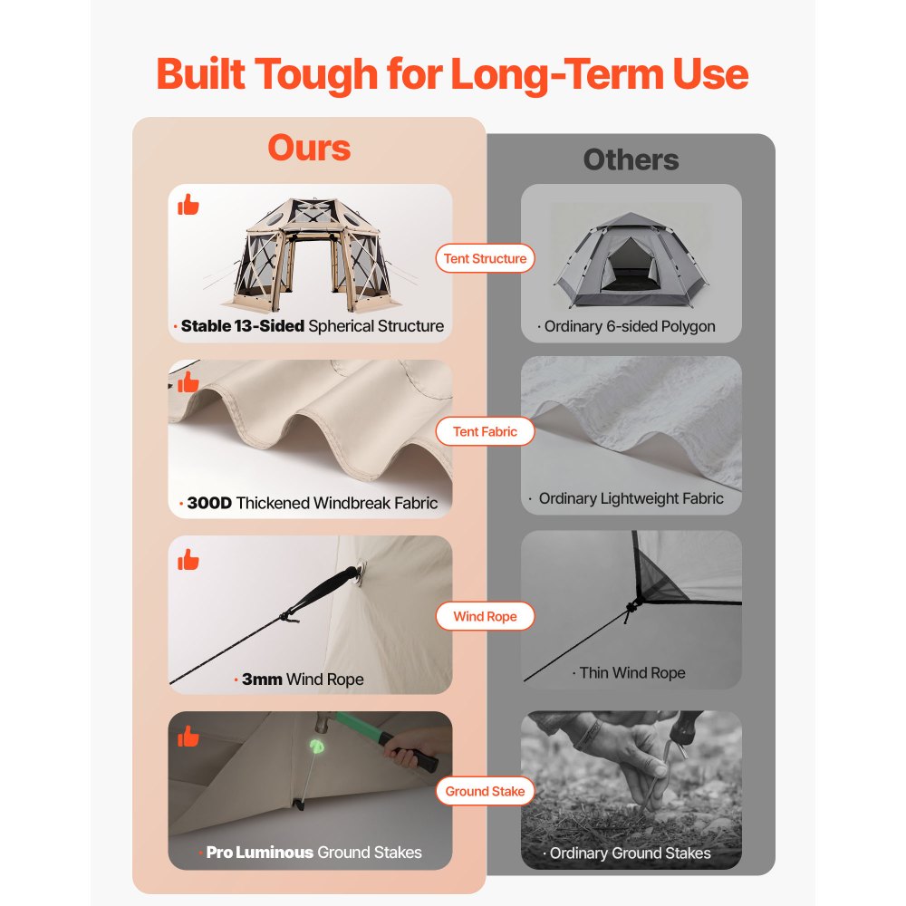 13stranná konstrukce odolná proti větru: Náš stan s vyztuženou geodetickou konstrukcí odolává zhroucení ve větru. Zesílené rolovací panely 300D poskytují ochranu před větrem a soukromí. Součástí je několik kolíků a kotevních lan pro bezpečné ukotvení do země. (Tip: Z bezpečnostních důvodů jej prosím během bouřek nebo silného deště rozeberte a uložte.)