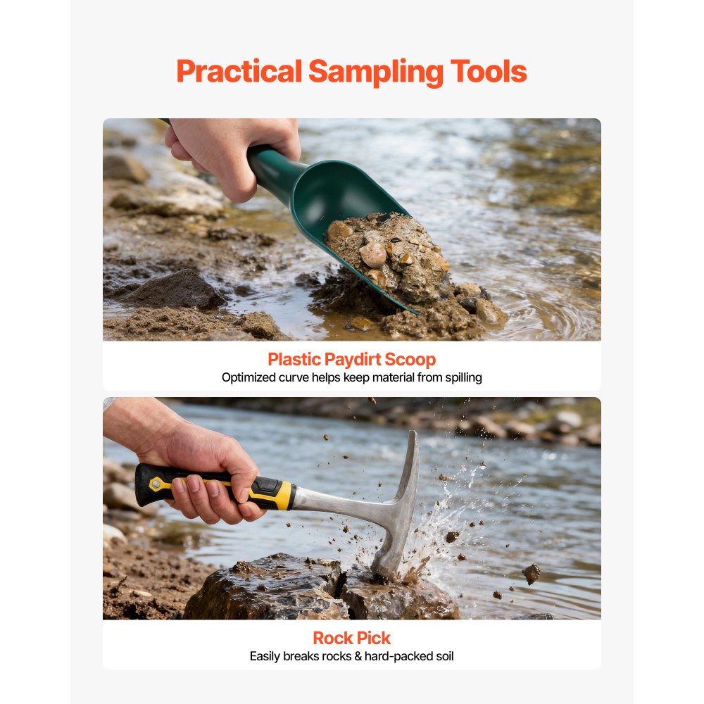 Vhodné pro začátečníky a snadné použití: Všechny nástroje v této sadě pro hledání zlata, od pánví s dvojitou drážkou až po odstraňovače nečistot, nevyžadují žádné zkušenosti a lze je zvládnout během několika minut.