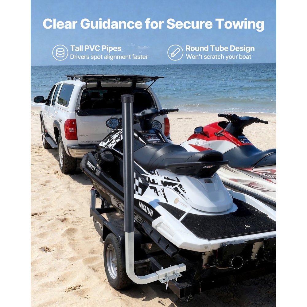 Vysoká PVC vodítka pro přívěsy na loď: Extra vysoká PVC vodítka pro přívěsy na loď zlepšují viditelnost pro snazší vyrovnání lodi během nakládání a umožňují řidičům sledovat stav přívěsu v reálném čase. Hladké, zaoblené PVC tyče chrání trup před poškrábáním a oděrkami.