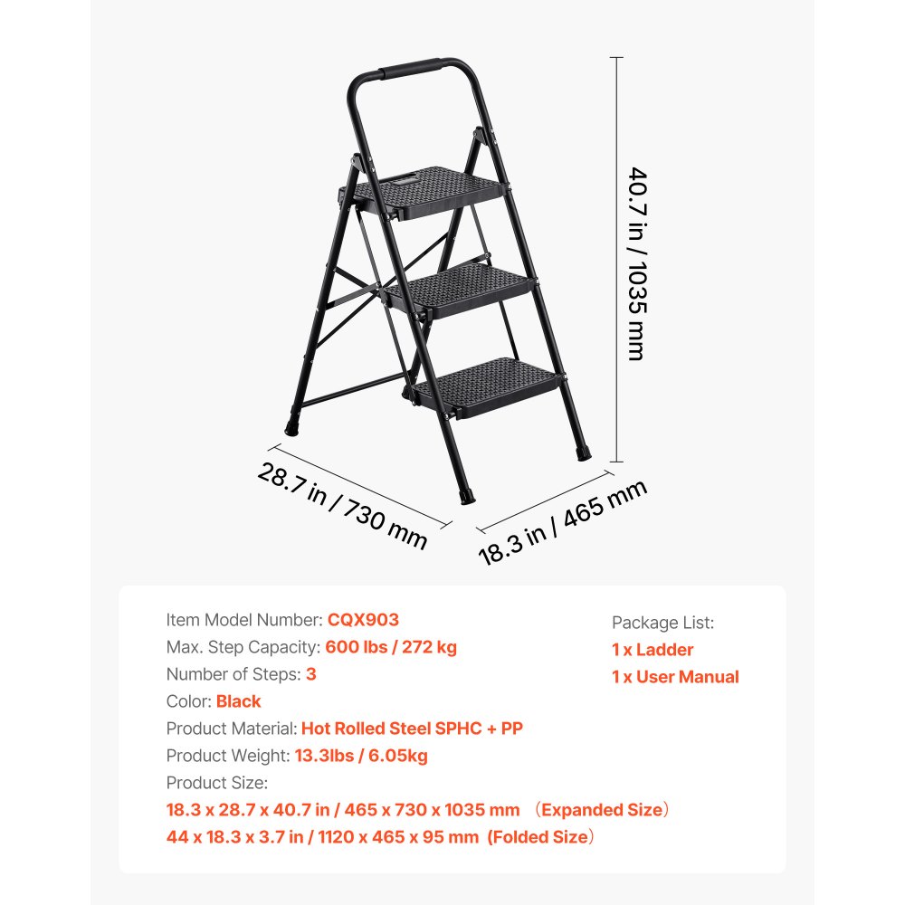 3-stupňový žebřík, skládací stolička s širokým protiskluzovým pedálem a pohodlnou rukojetí, lehký přenosný ocelový žebřík s nosností 272 kg, víceúčelový do kuchyně, domova, domácnosti a kanceláře, černý