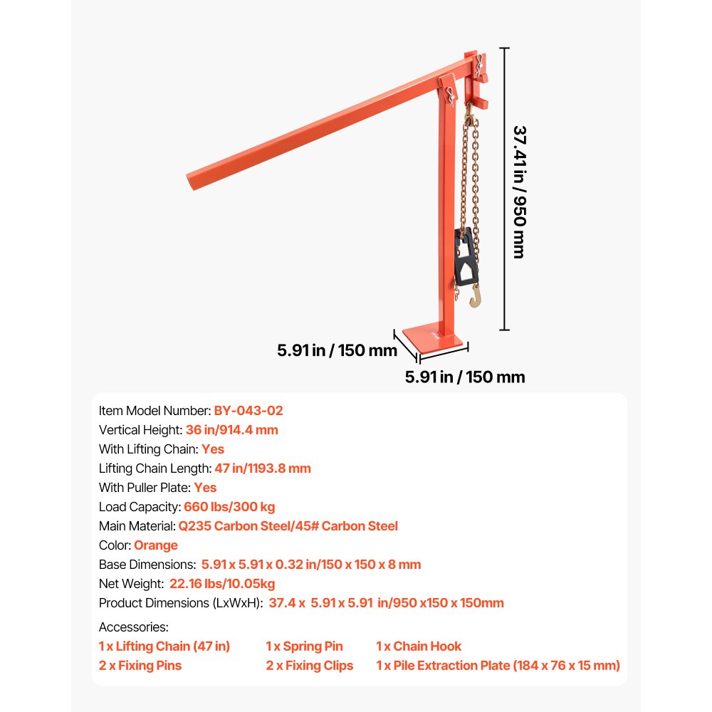 Snadné použití a skladování: Stahovák sloupků ve tvaru T má vertikální konstrukci, která šetří místo a zjednodušuje obsluhu. Díky menšímu počtu součástí než stahováky pařezů nebo zemních tyčí se s ním pohodlně manipuluje, snadno se skladuje a je vysoce efektivní při stahování sloupků.