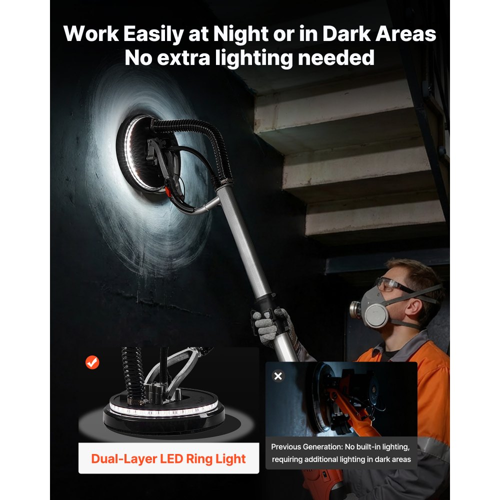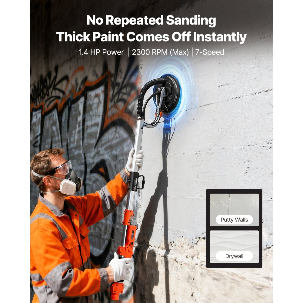 Výkonný motor 1,4 HP: Tato bruska na sádrokarton je vybavena robustním motorem s otáčkami až 2200 ot./min a 7 nastavitelnými rychlostmi. Je ideální pro stěny, podlahy a stropy a zvládá tenký tmel, silný nátěr a staré povrchy s hladším a snadnějším broušením.
