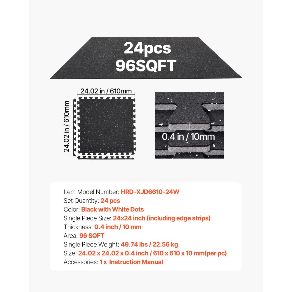Cvičební podložka VEVOR Puzzle, 24 dílů podložek na fitness vybavení, 610 x 610 x 10 mm, sada podložek z pěny EVA s vysokou hustotou, propojené gumové měkké dlaždice, ochranná podlahová výplň s bílými tečkami pro domácí posilovnu a kancelář