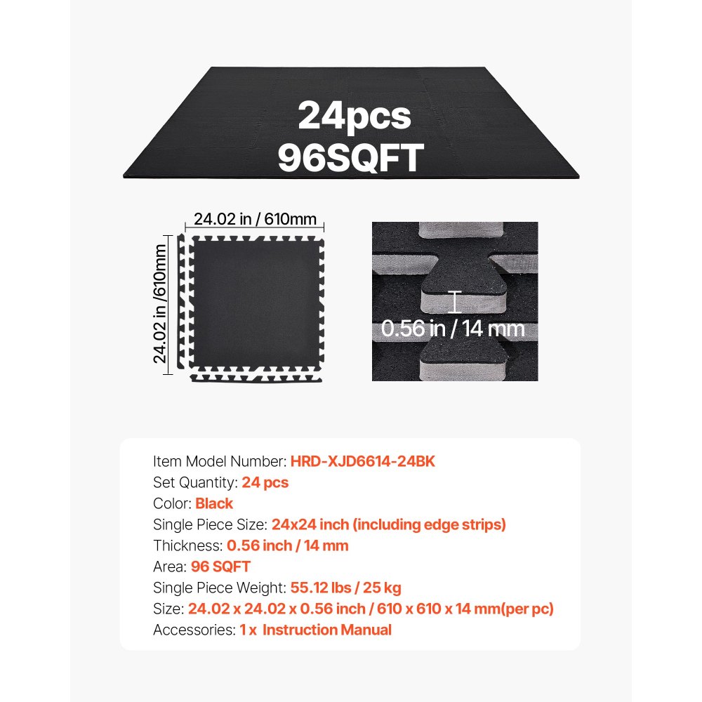 Cvičební podložka VEVOR Puzzle, 24 dílů podložek na fitness vybavení, 610 x 610 x 14 mm, sada podložek z pěny EVA s vysokou hustotou, propojené gumové měkké dlaždice, ochranná podlahová podložka pro domácnost, posilovnu, kancelář, černá