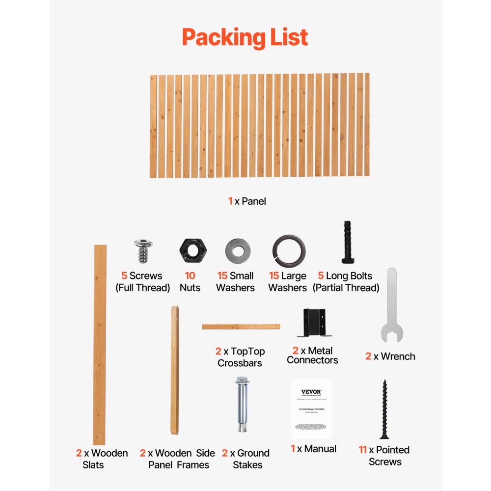 Co je součástí balení: 25 dřevěných latí, 2 dřevěné boční rámové panely, 2 zemní kolíky, 2 kovové spojky, 2 horní příčky, 5 dlouhých šroubů (s částečným závitem), 10 ks matic M6, 15 malých podložek, 15 velkých podložek, 5 šroubů s plným závitem, 11 špičatých šroubů, 2 klíče a 1 návod k použití.