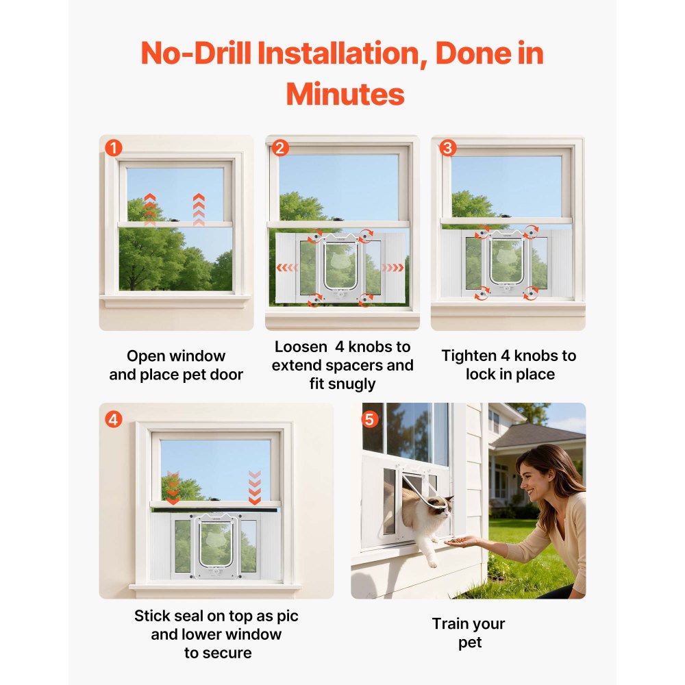 Instalace bez nářadí: Není třeba vrtat. Jednoduše vložte dvířka pro domácí mazlíčky do okenní kolejnice, utáhněte knoflíky a užijte si rychlé a úhledné nastavení.