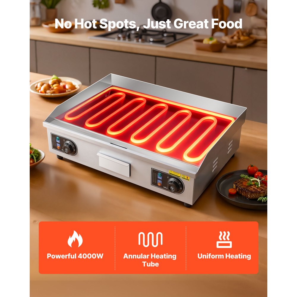 Elektrická grilovací deska VEVOR pro komerční použití, 655 x 400 mm, 4000 W, nastavitelná teplota 50–300 °C, nerezová pracovní deska s plochou deskou, 2 špachtlemi, 2 kartáči a 4 podložkami, na steaky (BEZ ZÁSUVKY)