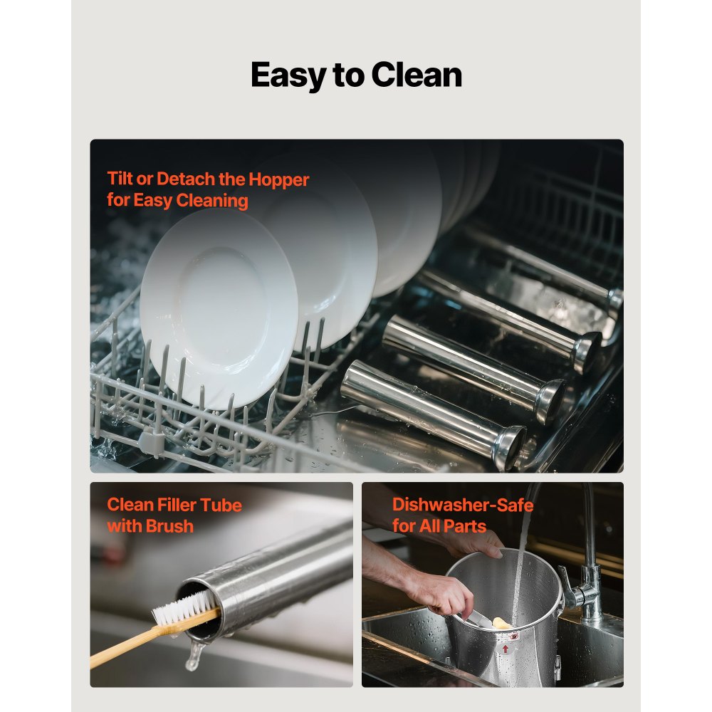 Jednoduché čištění: Tento stroj na plnění klobás je navržen s odnímatelnými součástmi, jako je válec, píst a trubice, které lze mýt v myčce nádobí. Vnější povrch z nerezové oceli se snadno čistí otíráním. Ideální pro domácí použití, komerční kuchyně, lov nebo přípravu čerstvého krmiva pro domácí mazlíčky.