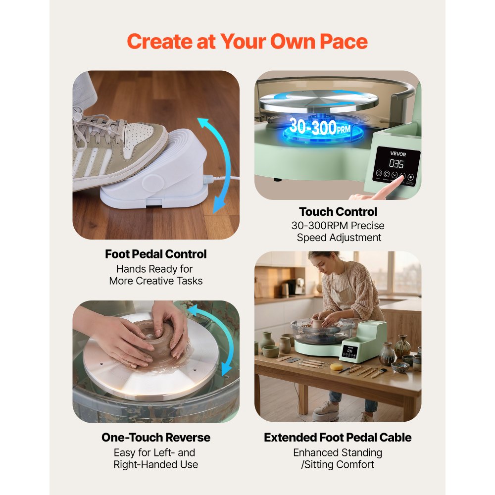 Hrnčířský kruh VEVOR pro dospělé, otočné talíře 36 a 28 cm, elektrický stolní hrnčířský kruh 450 W s nožním pedálem, nastavitelná rychlost 30–300 ot./min, odnímatelná mísa, pro začátečníky, kutilské umění z hlíny, zelený | Technologie | Originalnitextil.cz