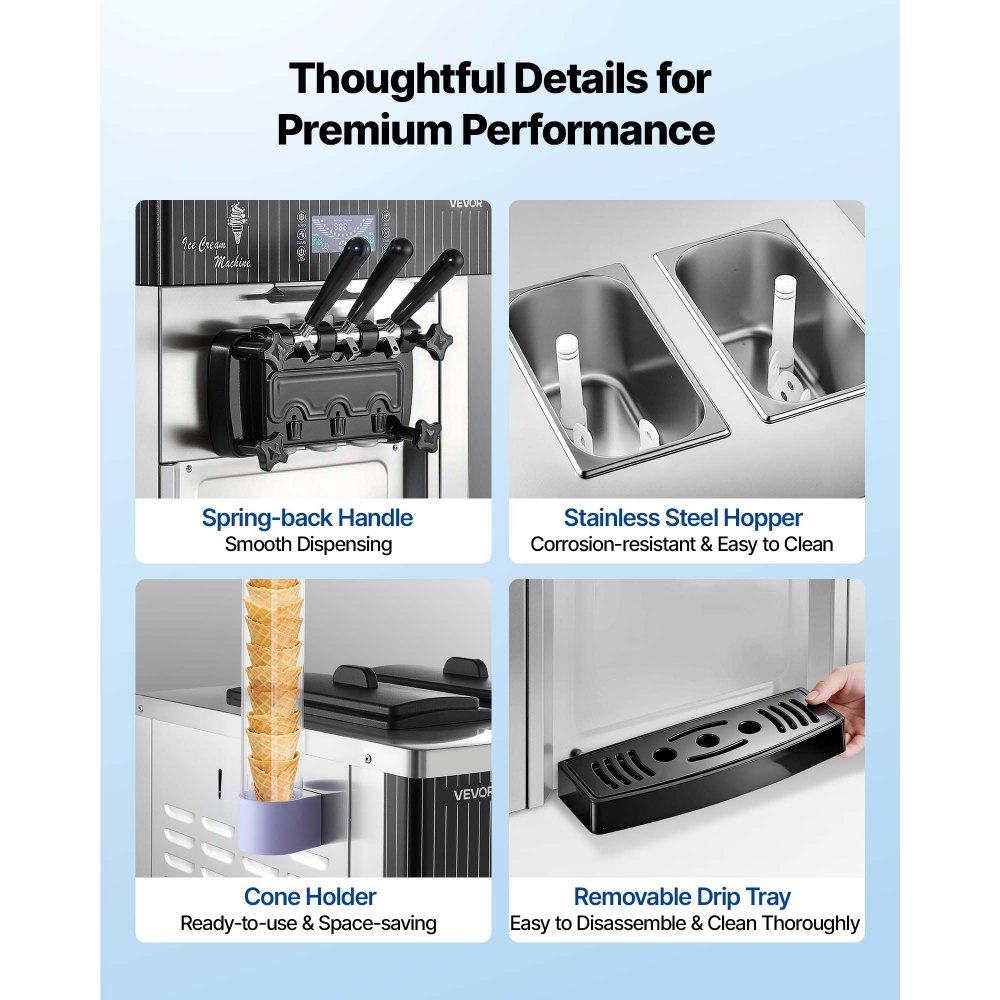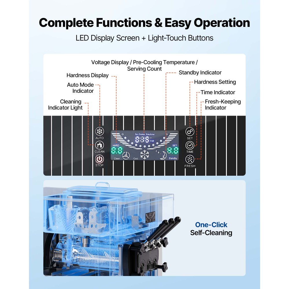 Komerční výrobník zmrzliny, výtěžnost 20-28 l/h, 2200 W stolní výrobník měkké zmrzliny pro 3 příchutě s 2 násypkami o objemu 6 l a mícháním násypky, předchlazování, samočištění pro obchody s občerstvením a dezerty | Technologie | Originalnitextil.cz