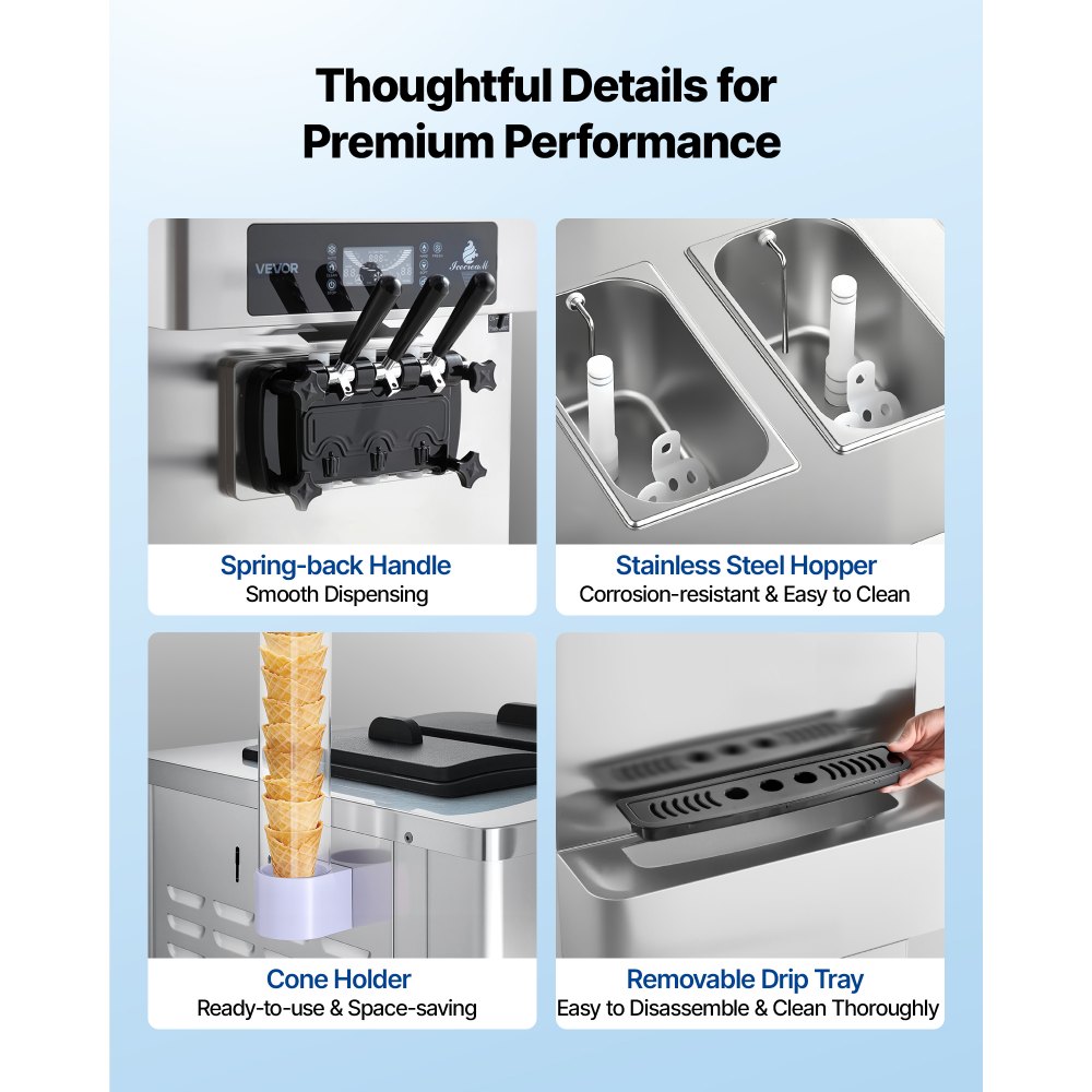 Předchlazení a uchování čerstvosti: Volně stojící komerční výrobník zmrzliny VEVOR dokáže vyrobit až 20–28 l/h a zajistit tak nepřetržitou dodávku 8–12 porcí bez přerušení. Systém předchlazení a uchování čerstvosti předchlazuje směs na ≤12 °C, čímž zajišťuje její čerstvost a zabraňuje jejímu znehodnocení i při vysokých teplotách nebo během skladování přes noc.