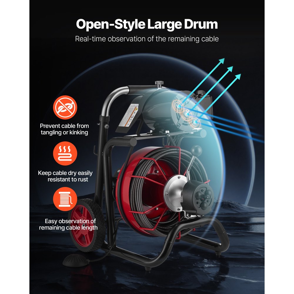 Čistič odpadů VEVOR 30 m x 10,5 mm, automatický šnekový dopravník na kolečkách - s 8 řeznými zuby a vzduchem aktivovaným nožním spínačem pro potrubí o průměru 50 mm až 100 mm