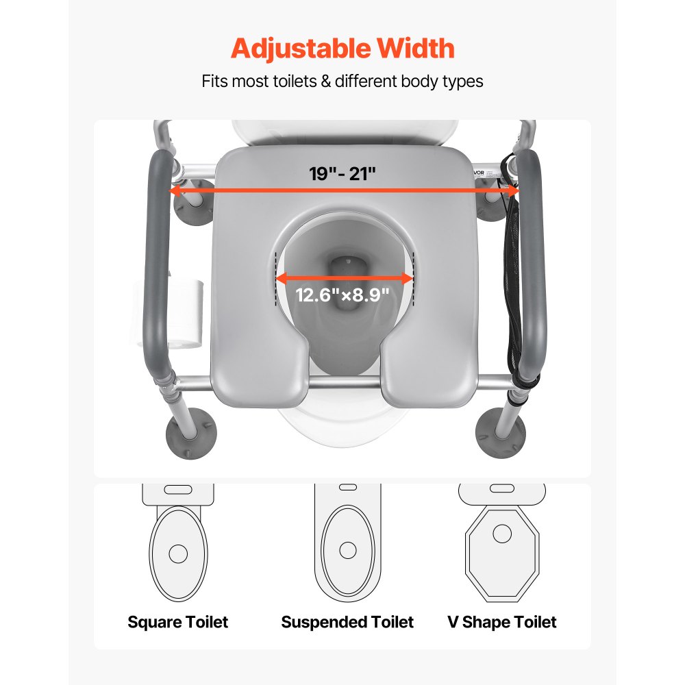Noční toaletní židlička VEVOR, nosnost 227 kg, přenosná toaleta 4 v 1 a vyvýšené sedátko s polstrovaným sedákem a opěradlem, odnímatelný 5l kbelík, nastavitelná výška a šířka, nočník pro seniory