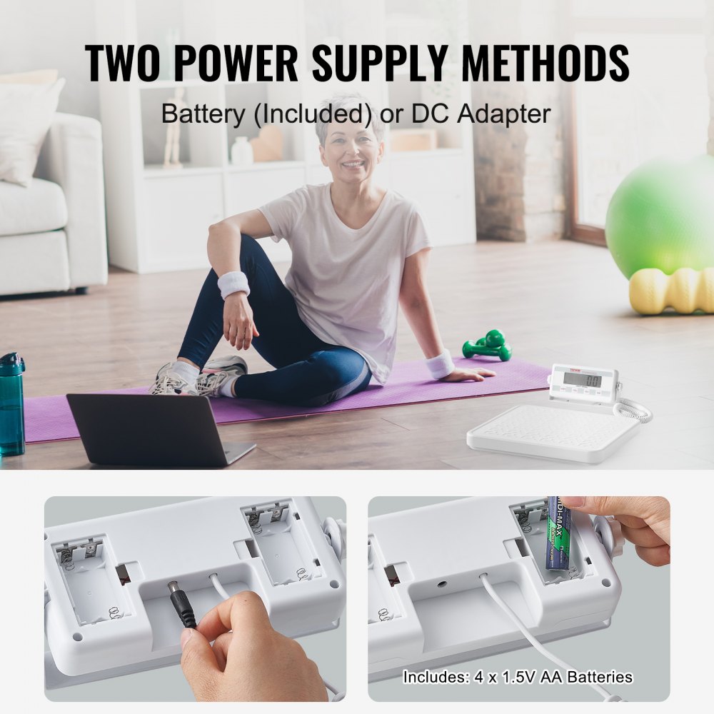2 možnosti nabíjení: Vychutnejte si nepřetržité používání díky dvěma způsobům nabíjení naší digitální váhy – baterií nebo stejnosměrným adaptérem (oba jsou součástí balení). Dodáváme 4 x 1,5V AA baterie, takže budete vždy připraveni k přesnému měření, ať už doma nebo na cestách.