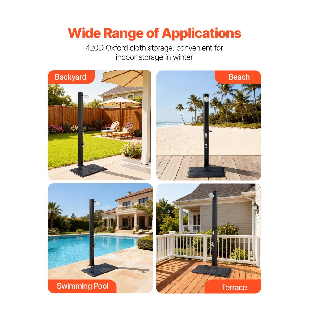 Solární sprcha VEVOR 35L, výška sprchové hlavice 195 cm, venkovní sprcha, s podlahovou sadou a nožní baterií, nastavení teplé a studené vody, volně stojící pro zahradní bazén a plážový bazén, černá