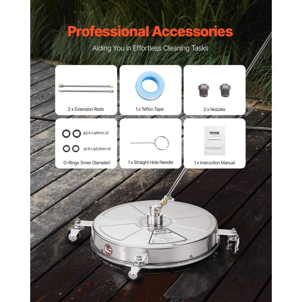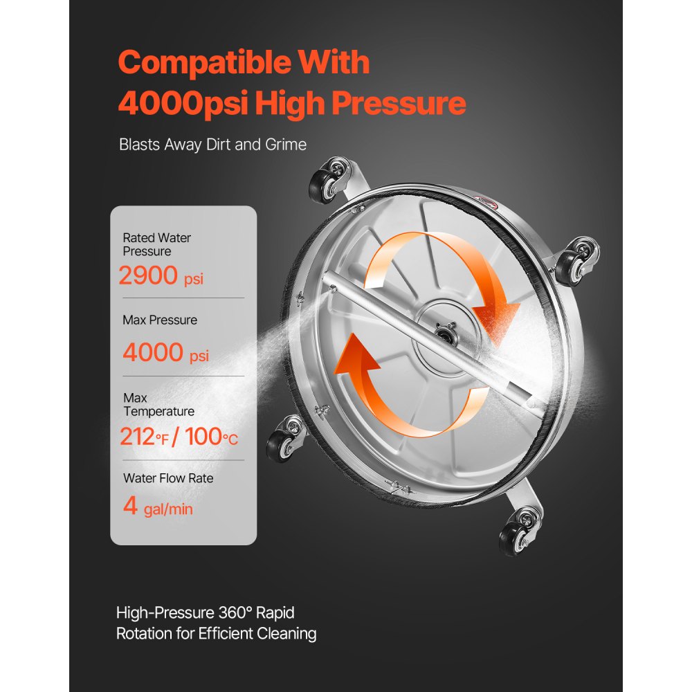 Rychlé a efektivní čištění s tlakovou vodou φ18 palců: Díky vysokému průtoku 4 gal/min zajišťuje tento tlakový čistič povrchů s tlakovou vodou φ18 palců rovnoměrné pokrytí a nezanechává žádné skvrny. Ať už se jedná o velký úkol nebo běžné čištění, práce je snadná. Užívejte si efektivní čištění a zároveň šetříte čas a úsilí.