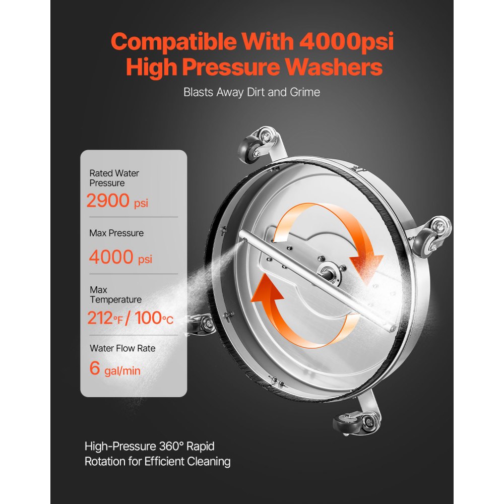 φ20 palců Rychlé a efektivní: Čistěte více a rychleji! Díky výkonnému průtoku 6 galonů/min tento tlakový čistič povrchů s průměrem φ20 palců vyčistí každý centimetr, takže je ideální jak pro velké úkoly, tak pro každodenní čištění. Zvládněte práci rychle a bez námahy – ušetříte tak čas a energii!